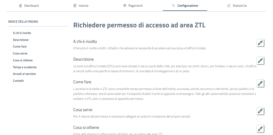 Cliccando su "Modifica Testo", ovvero il simbolo della matita, si accede alla pagina del servizio in cui è possibile modificare ogni informazione cliccando sul simbolo della matita.