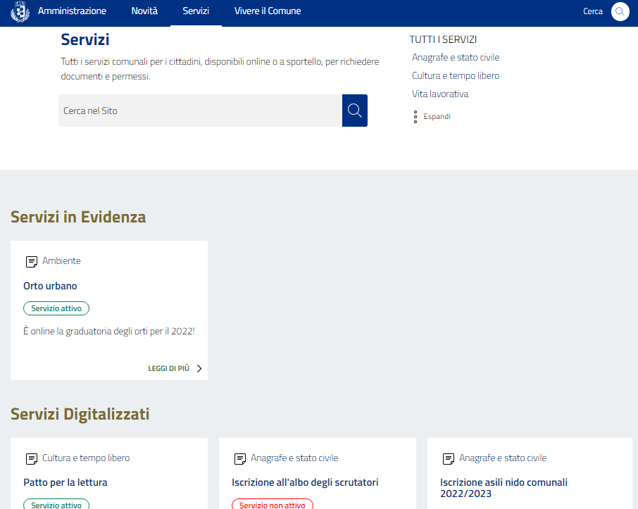 Questo contenuto permette di creare pagine dedicate ai Servizi Comunali, il cuore pulsante del portale che permette ai cittadini di accedere telematicamente a tutti i servizi del Comune.