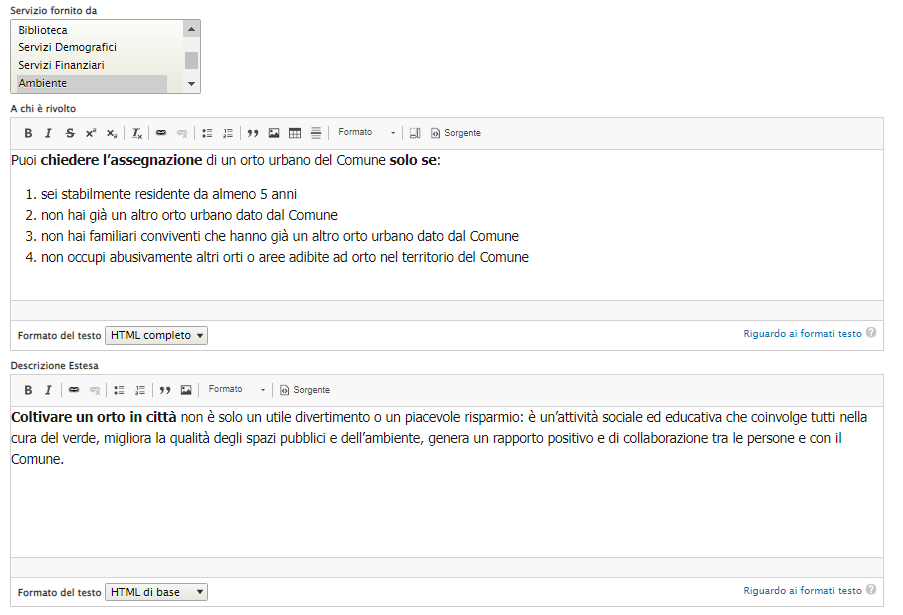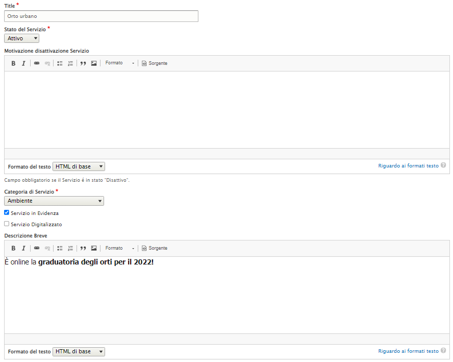 - Popolare la "Descrizione breve", ovvero il testo che compare sotto il titolo nel box del servizio, con una breve sintesi.